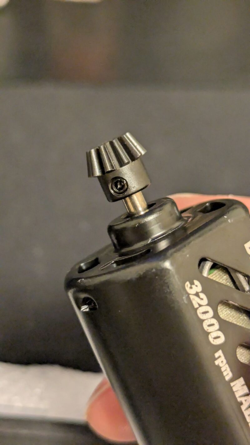 ピニオンギアはイモネジ締め込みタイプ(D型)です。O型と違って固定がしっかりできるタイプ。