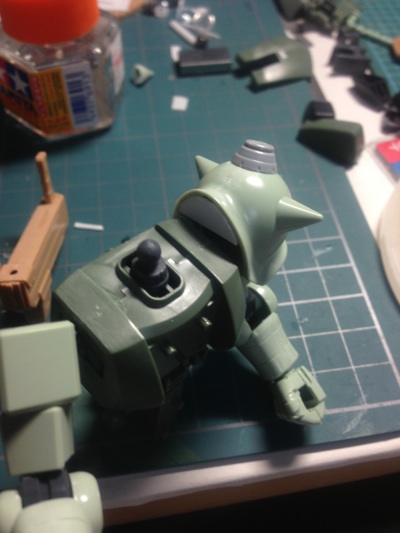 ザクハーフキャノン ザクハーフキャノン 3 ザクハーフキャノン 2012.11.012025.12.03 本体工作終わりましたショルダーアーマーの接続方法を変えたり軽く筋彫りしたり 上のスパイクだけ取り外したように表現してみました アーマーを肩の上側で接続してガッシリとした印象に接続部が見えるとカッコ悪いのでカバーもつけます バックパック全体図これでいきます